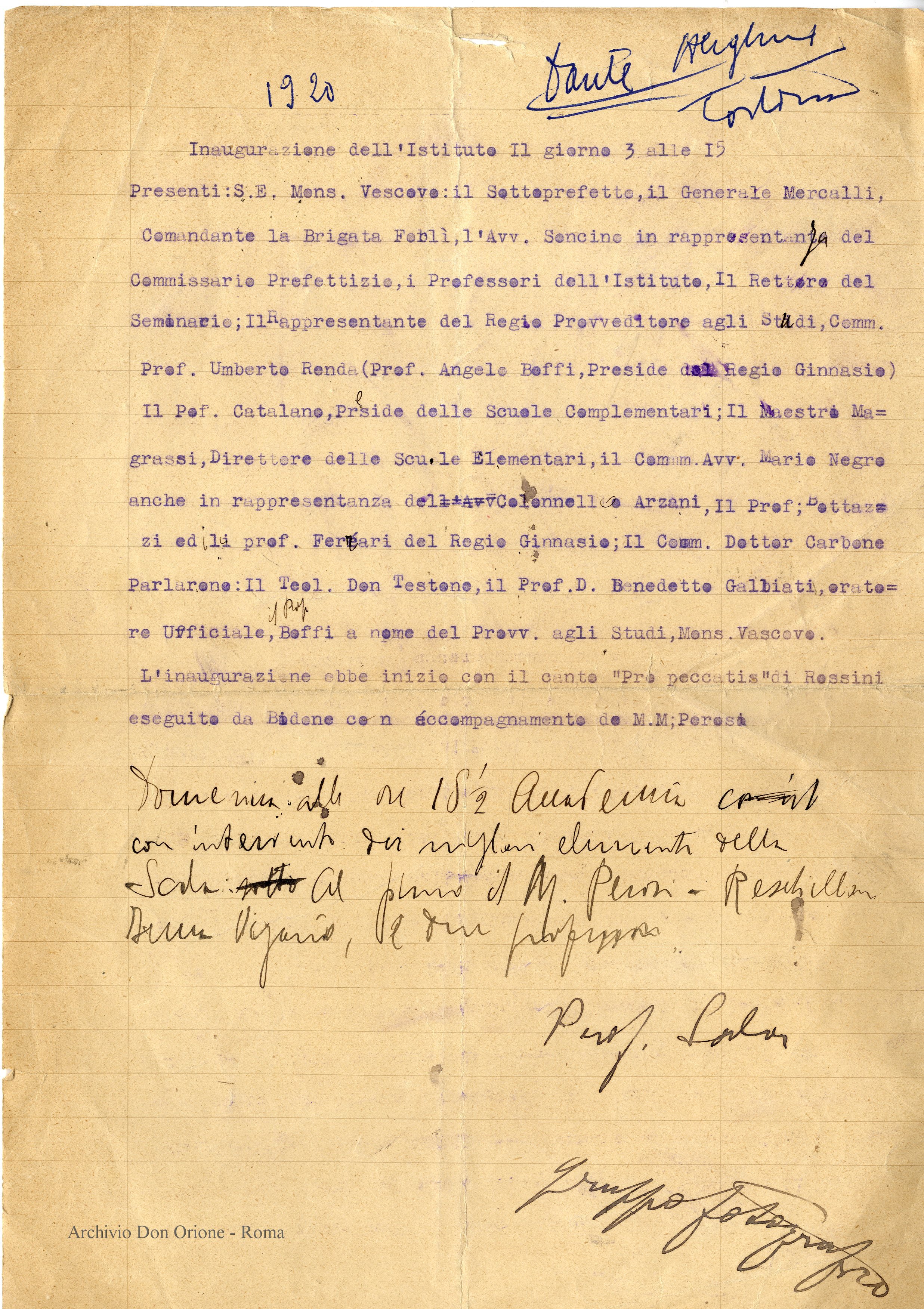 Di seguito il resoconto della giornata inaugurale del prof. Sala che vede presente personaggi insigni tra cui il Maestro Perosi direttore del Coro della Cappella musicale pontificia sistina .